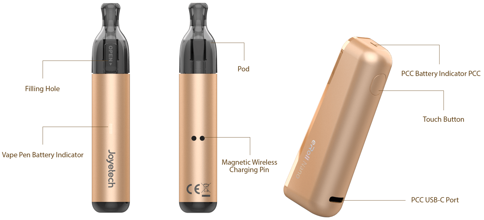 Най-новото попълнение в серията eRoll, eRoll Nano подобрява преносимостта със своя компактен дизайн, като същевременно се гордее с общ капацитет на батерията от 1110mAh. С функцията си за магнитно безжично зареждане, PCC може удобно да презареди устройството по всяко време, като гарантира на потребителите, че могат да се наслаждават на вейпинга си по всяко време.